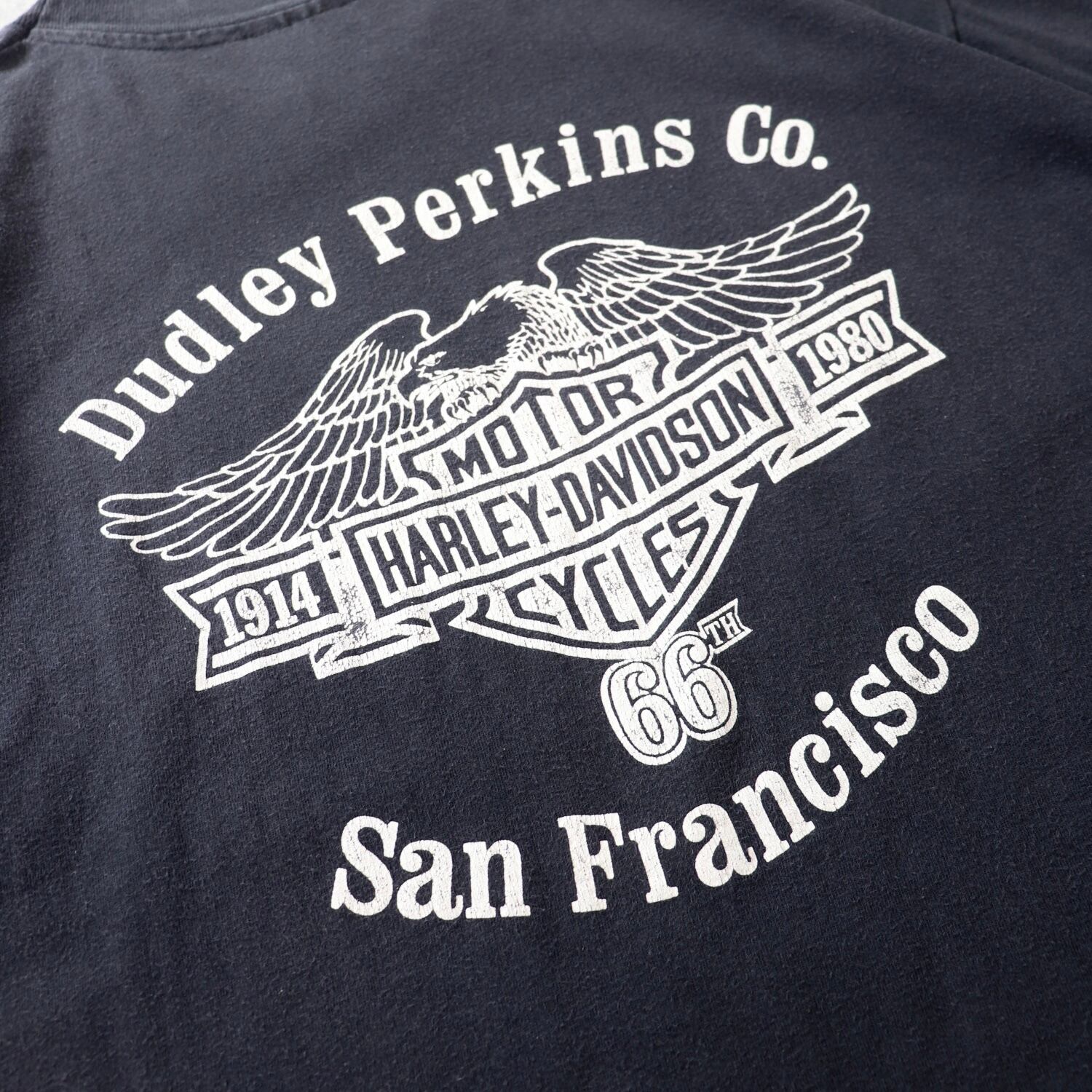 サンフランシスコの名門ディーラー「Dudley Perkins Co.」がディーラー創業66周年を迎えた1980年に記念して刷った一着で、ハーレータグが付く前の袖裾シングルステッチの古いHanesボディが使われてます。