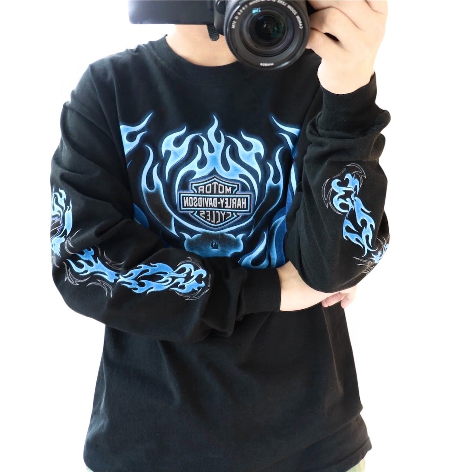 harley davidson flame flames blue fire biker vintage used tee t-shirt t shirt long sleeve ハーレーダビッドソン バフレイム ファイヤー バイカー ビンテージ ヴィンテージ ヴィンテージ tシャツ ロングスリーブ ロンT オールド ユーズド 90s 00s y2k 古着