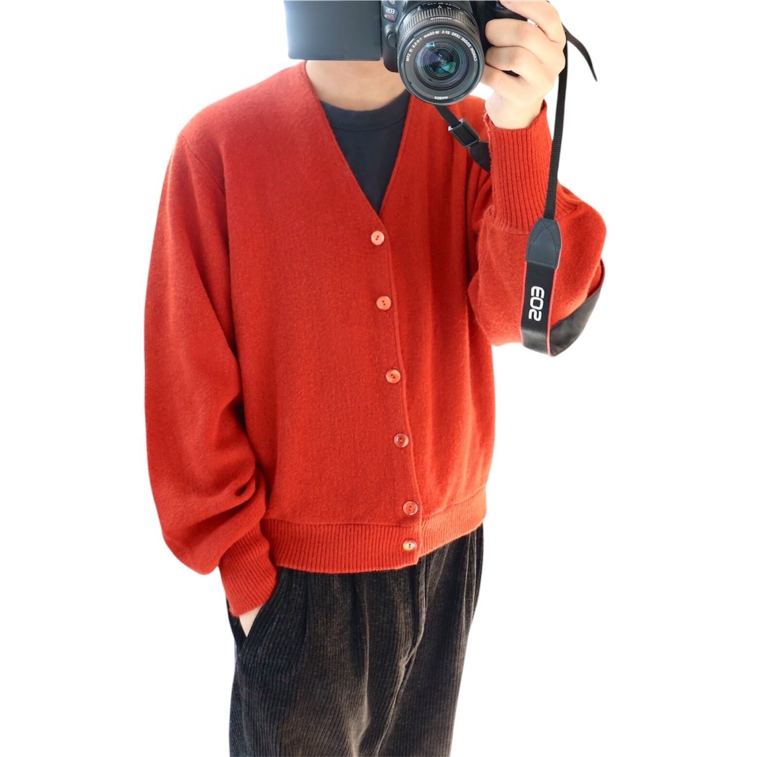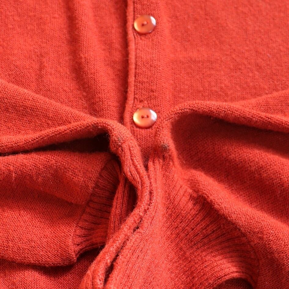 アクリル特有の柔らかな落ち感とアクリルカーディガンならではの発色の良いオレンジが抜群に映える一枚。
