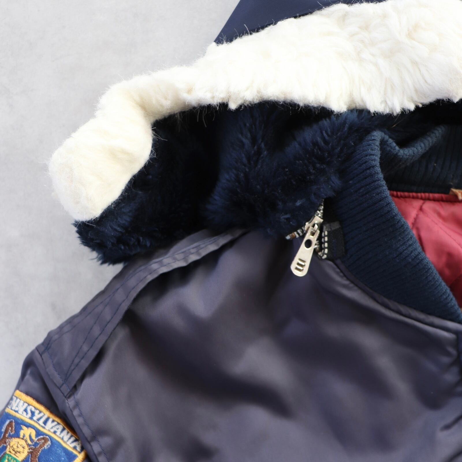 ネイビーというかパープルっぽくもあり、内側のキルティングはえんじ色でそれだけでもかっこいいのですが、なんとレアなフード付き。